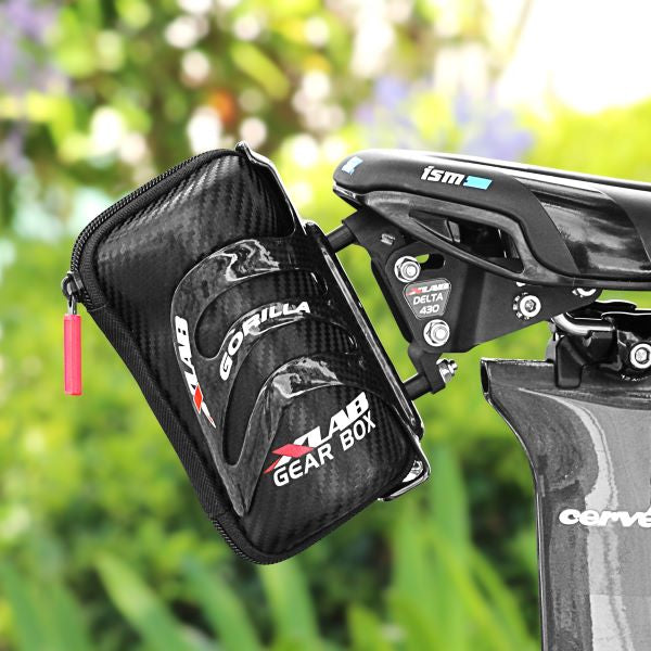 Grab-and-go, stealth ‘carbon-look’ repair storage case. Full GEAR BOX KIT includes state-of-the-art clincher repair kit.